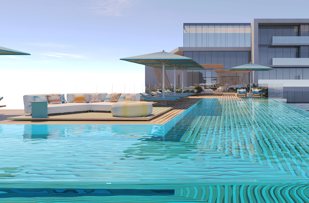 The balcony’s movable sunscreens provide residents with flexible shading options, while the full vision glass panels offer an uninterrupted view of the Arabian Gulf water.