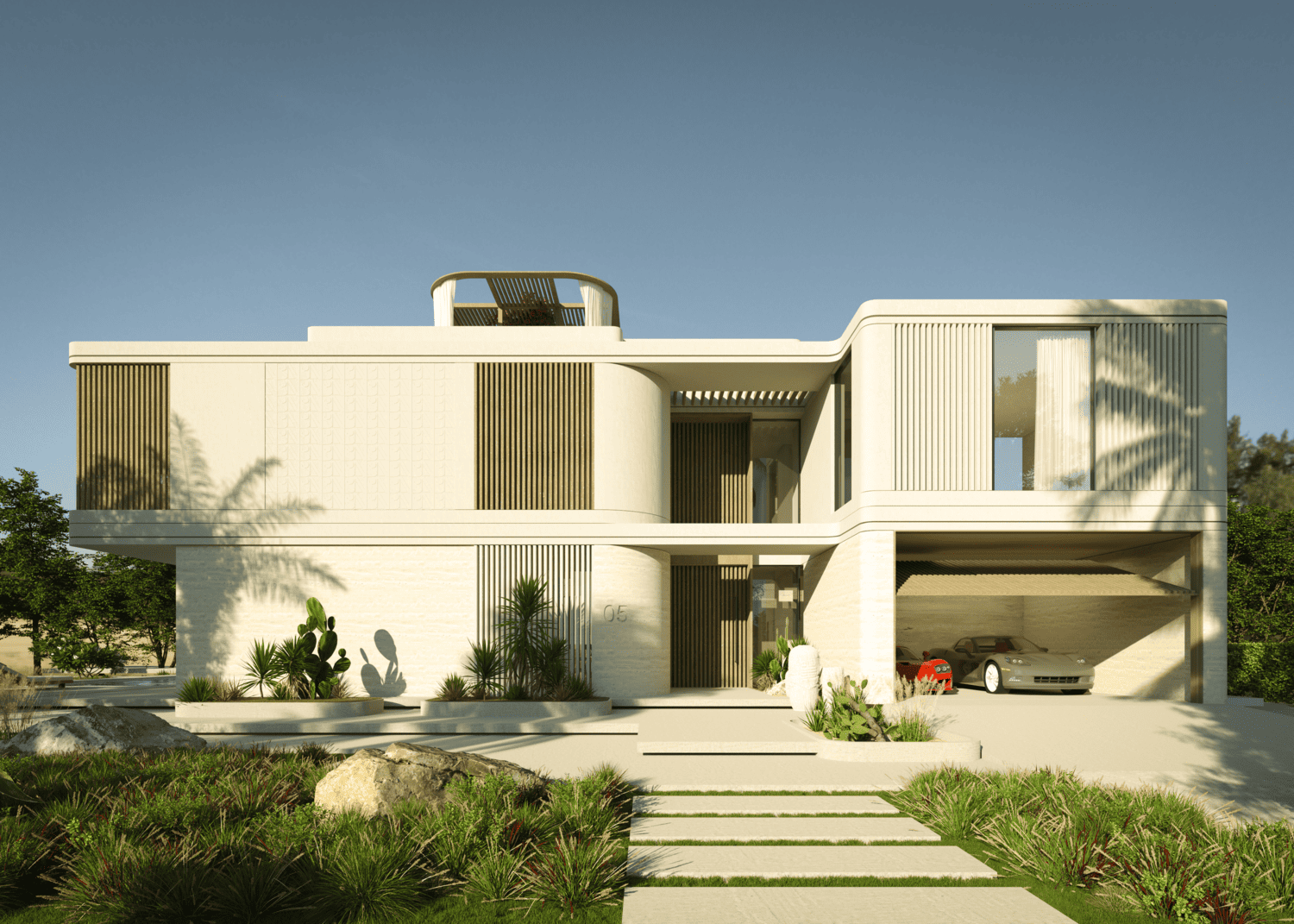 NB Collection offer an immersive garden experience. Articulated spaces integrate the garden into the home, creating a unique indoor-outdoor connection. The centrally located entrance provides easy access to all ground floor areas. A double-height space maximizes façade openings toward the front gardens, enhancing visual connection. Living, dining, and kitchen areas open directly to the outdoors. All four first-floor bedrooms face the gardens, offering scenic views. The rooftop features a plunge pool and lounge with sea views. Integrated parking and elegant façades blend luxury with modernity.