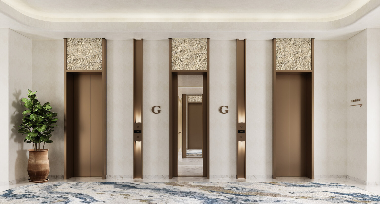 The grandeur of the entrance lobby is finished by a melange of textured surfaces, with the panoramic view outside framed by sheer drapery and complemented by polished walls. The inviting interiors are a melody of stone and metal accents, featuring tiles, wood finishes, and textured glass. An mix of high quality stone, wood, fabric, and metal elements enhances both visual and tactile experiences in every room whilst emphasising sophisticated elegance, tranquillity, and the intimacy of one’s personal space.